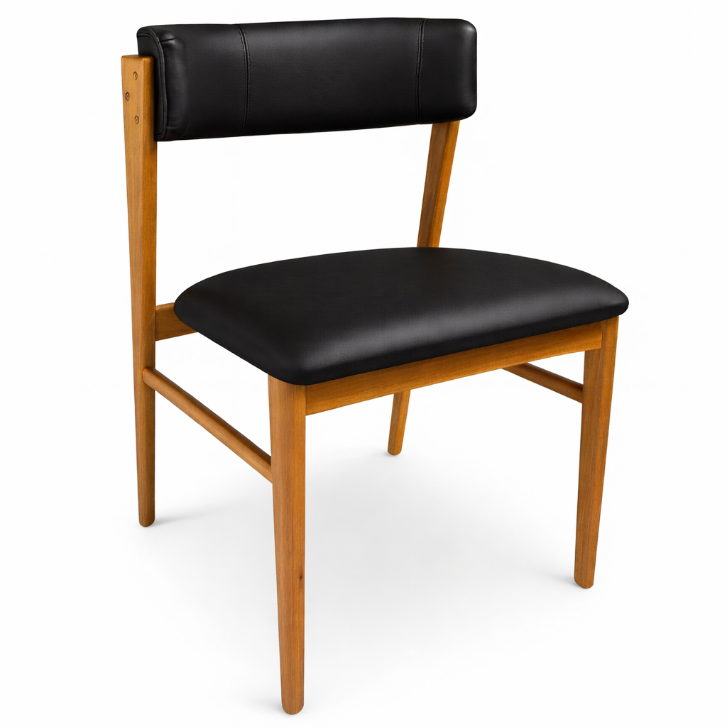 Cadeira de jantar resistente e elegante, feita com estrutura em madeira maciça de eucalipto e assento em couro preto para maior conforto.